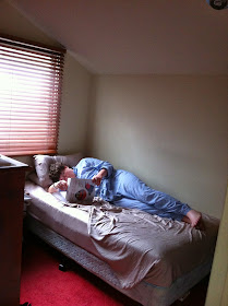 This shows a typical picture of me lying down in my bedroom – here reading the wonderful eighth volume of ‘Handbook of the Birds of the World’ |